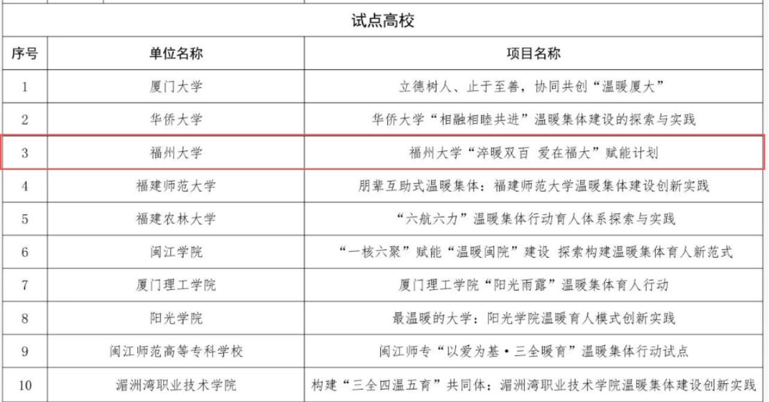 近日,省教育厅公布“温暖集体行动”试点单位,福州大学成功入选福建省“温暖集体行动”试点建设高校。