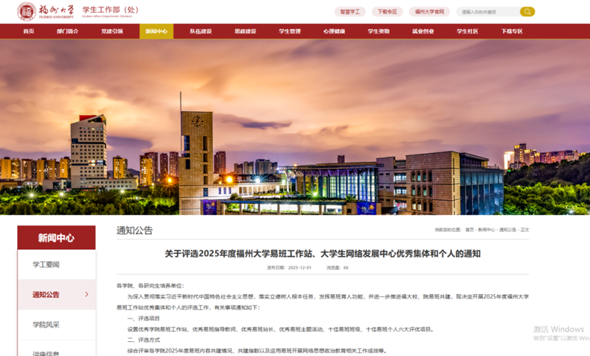 为充分发挥大学生网络发展中心网络育人平台功能,进一步推进校、院易班共建工作,近日学校正式启动2025年度福州大学易班工作站、大学生网络发展中心优秀集体和个人的评选工作。此次评选共设置“优秀学院易班工作站”“优秀易班指导教师”“优秀易班站长”“优秀易班主题活动”“十佳易班班级”“十佳易班个人”等六大奖项。评审工作将综合考评各学院本年度易班平台内容建设、共建指数及运用易班开展网络思想政治教育的相关成效。年度评选旨在通过典型选树、榜样示范,进一步激发师生参与网络文化建设和网络思想政治教育的积极性,推动学校网络育人工作走深走实,助力营造清朗向上、协同育人的校园网络环境。(学工部思想政治教育科供稿)