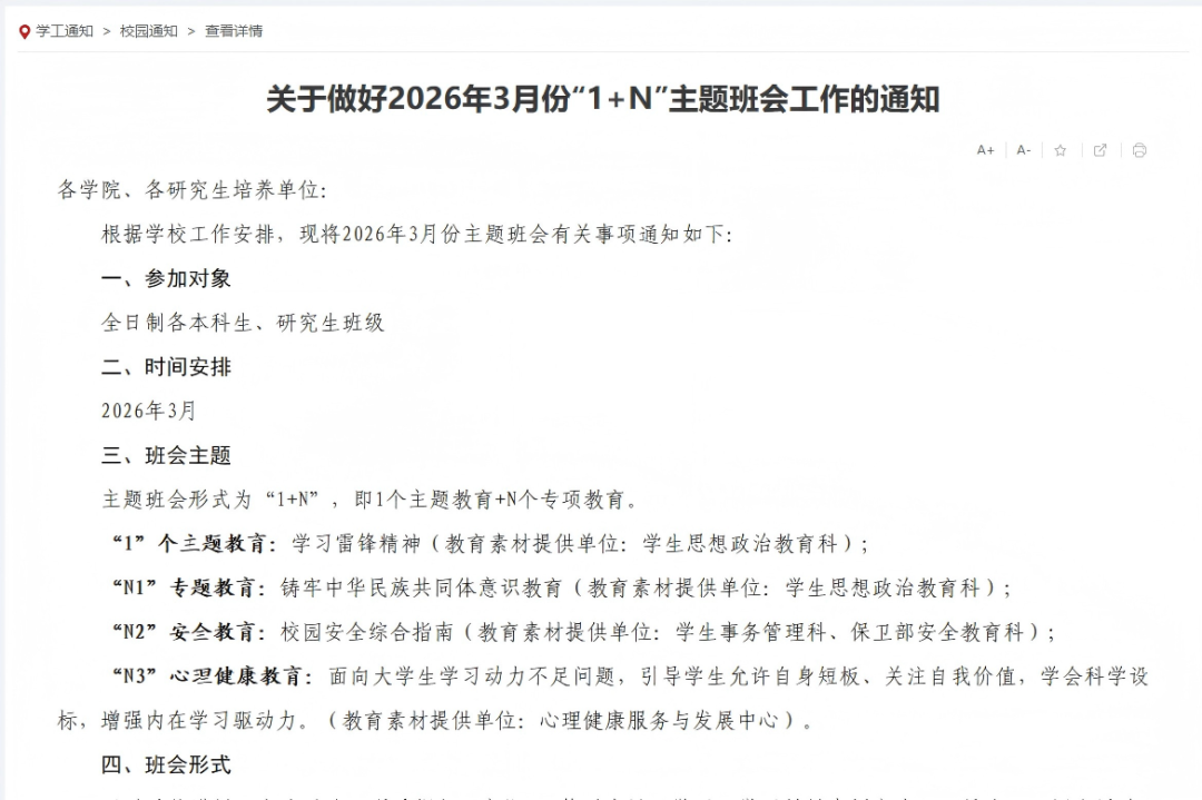 近日,我校正式启动2026年3月份“1+N”主题班会工作。本月班会以学习雷锋精神为核心,结合铸牢中华民族共同体意识教育、校园安全综合指南及心理健康教育等专题展开。班会形式丰富多样,鼓励通过系统讲授、交流讨论及观看视频等方式深化学习成效,引导学生在传承榜样力量中践行奉献精神,在增进民族团结中凝聚奋进共识,在强化安全素养中筑牢平安防线,在关注心理健康中赋能全面发展,推动实现学思用贯通、知信行统一,切实提升育人实效。(学工部思想政治教育科供稿)
