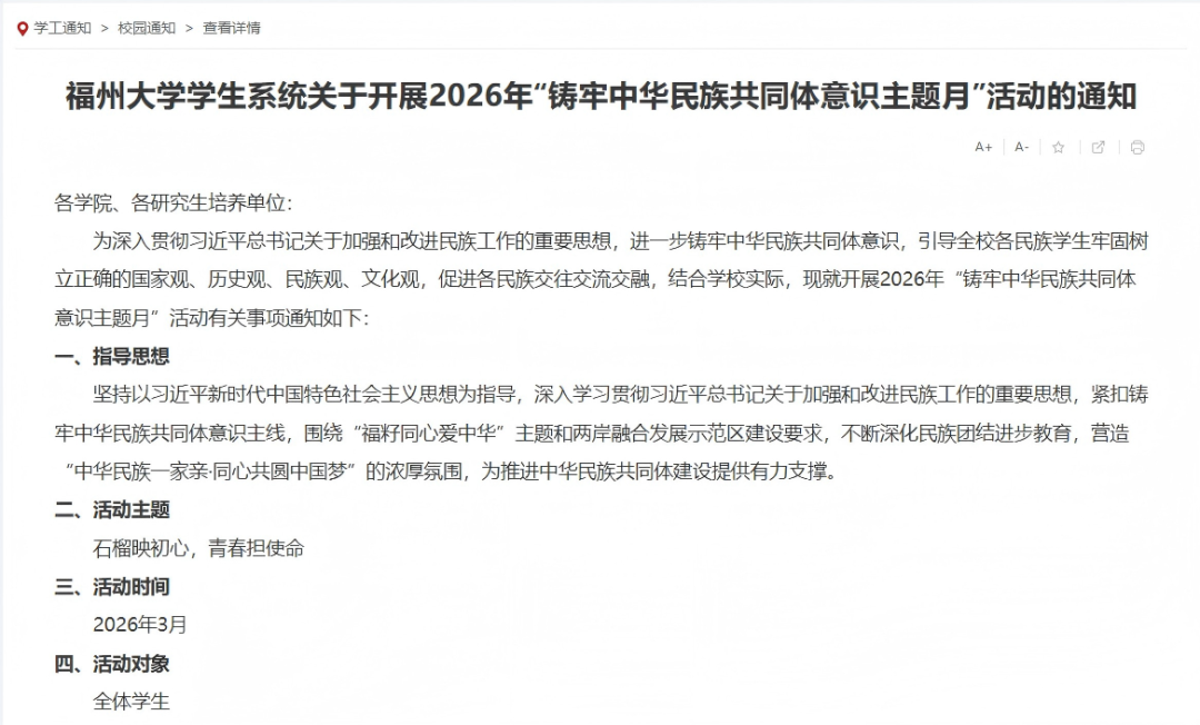 为深入学习贯彻习近平新时代中国特色社会主义思想,引导全校各族青年树立正确国家观、历史观、民族观、文化观,我校于2026年3月正式启动“铸牢中华民族共同体意识主题月”活动。本次活动以“石榴映初心,青春担使命”为核心主题,紧扣铸牢中华民族共同体意识主线,依托刘敏榕工作室等育人平台,组织开展“1+N”系列活动,涵盖主题班会、民族知识云竞答、结对帮扶、先进宣讲、摄影征集、普法志愿、社会实践等内容,推动民族理论学习、文化传承与实践体验深度融合。学校将加强组织统筹,打造特色品牌,引导广大青年像石榴籽一样紧紧抱在一起,不断增强“五个认同”,以青春担当助力中华民族共同体建设。(学工部学生事务管理科供稿)