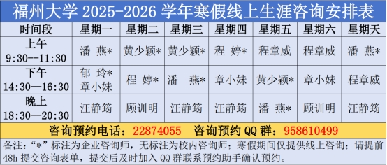 在就业指导、生涯发展等咨询指导服务方面,学校坚持线上服务不停歇。需要咨询或帮助的同学,可加入“福州大学生涯咨询预约群”(群号:958610499)或直接进行生涯咨询预约(预约表单:https://www.wjx.top/vm/hAjglHG.aspx),学校安排了多位资深咨询老师(星期一至星期日)在线提供咨询指导。