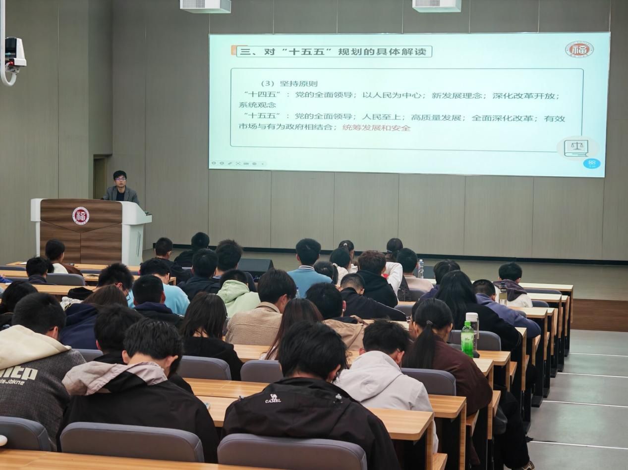 侯辰龙老师以《深入学习贯彻党的二十届四中全会精神,为中国式现代化新征程贡献青春力量》为主题展开系统解读。他结合“十五五”时期国家发展的重点方向,阐释了推动重点产业提质升级、提升产业链自主可控能力、统筹高质量发展与安全等重要部署,侯老师还联系“实体经济与数字经济融合”“人工智能+行动”等内容,鼓励同学将专业所学融入国家发展大局。宣讲过程中,侯辰龙老师注重贴近学生思想实际,通过鲜活案例将宏观政策与青年责任联系起来。他指出,当代大学生身处国家迈向第二个百年奋斗目标的关键时期,要主动关注时代变革、理解国家战略,在科技创新、产业振兴等领域找准奋斗方向,努力成为具备家国情怀、扎实学识与实践能力的时代新人。